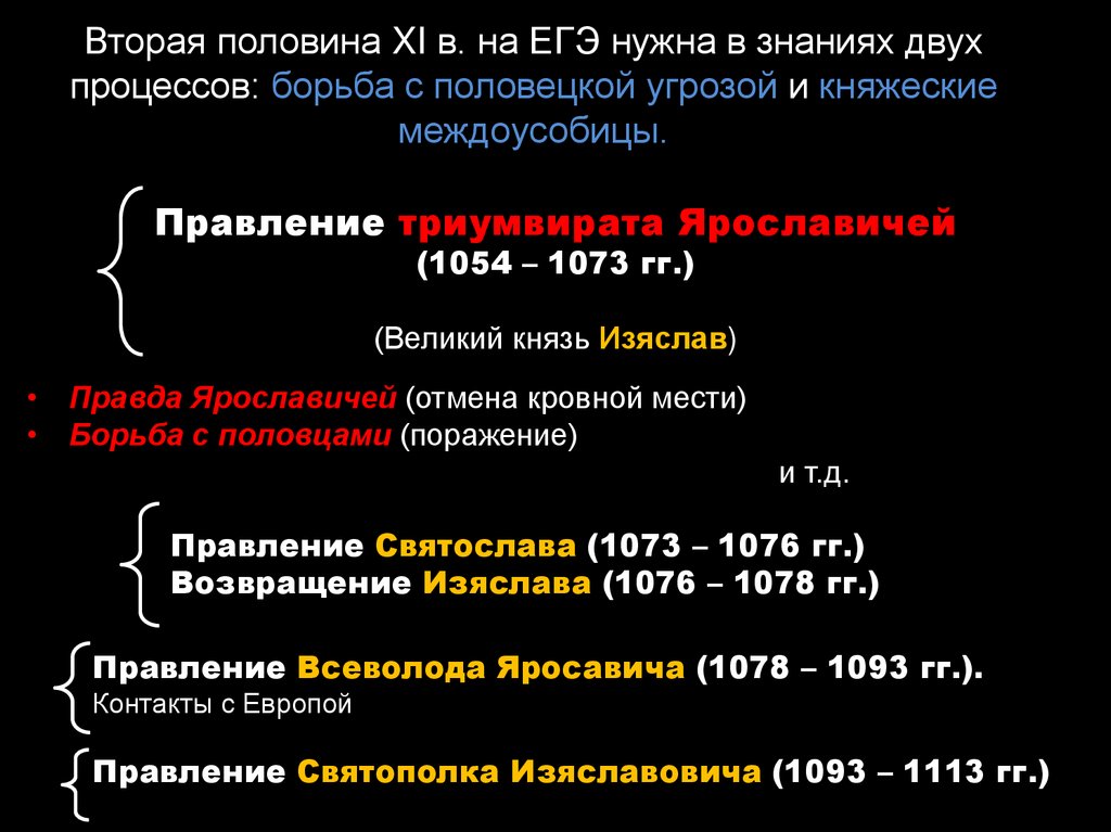 Вторая половина XI в. на ЕГЭ нужна в знаниях двухпроцессов: борьба с половецкой угрозой и княжеские