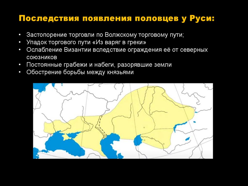 Последствия появления половцев у Руси:• Застопорение торговли по Волжскому торговому пути;