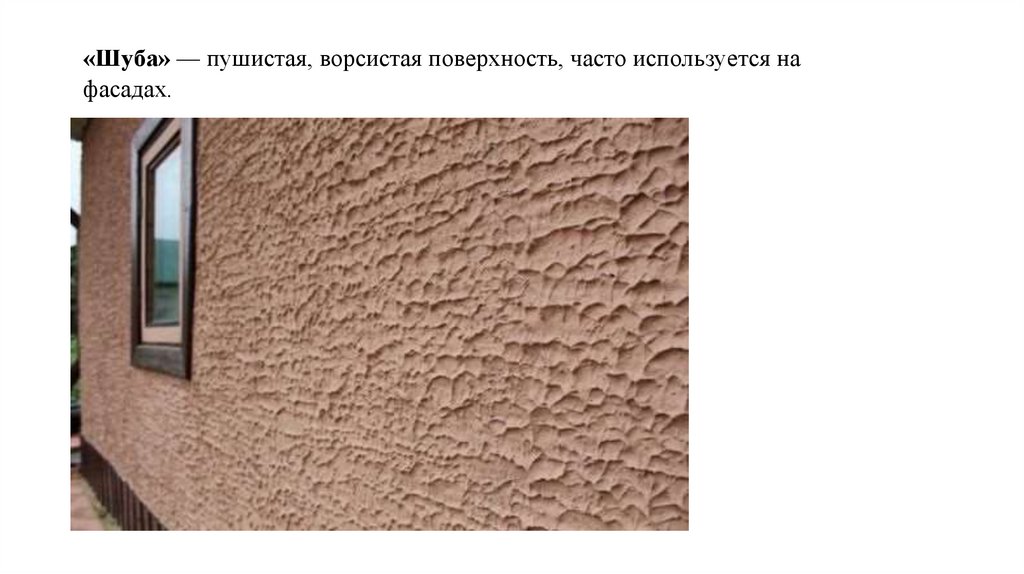 «Шуба» — пушистая, ворсистая поверхность, часто используется нафасадах.