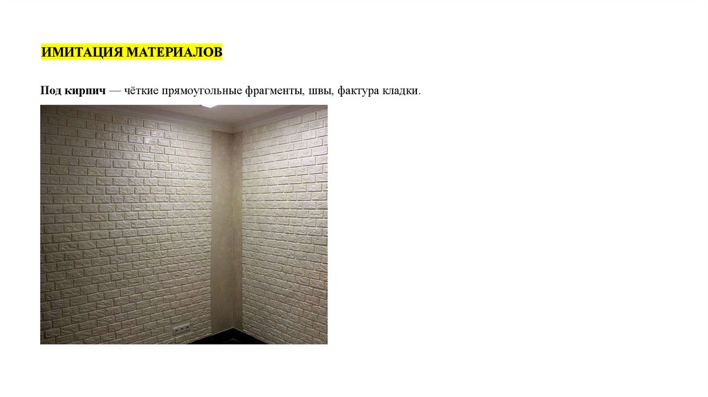 ИМИТАЦИЯ МАТЕРИАЛОВПод кирпич — чёткие прямоугольные фрагменты, швы, фактура кладки.