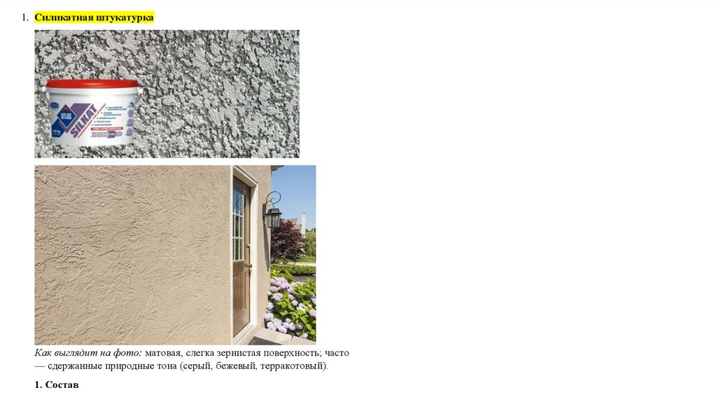 1. Силикатная штукатуркаКак выглядит на фото: матовая, слегка зернистая поверхность; часто