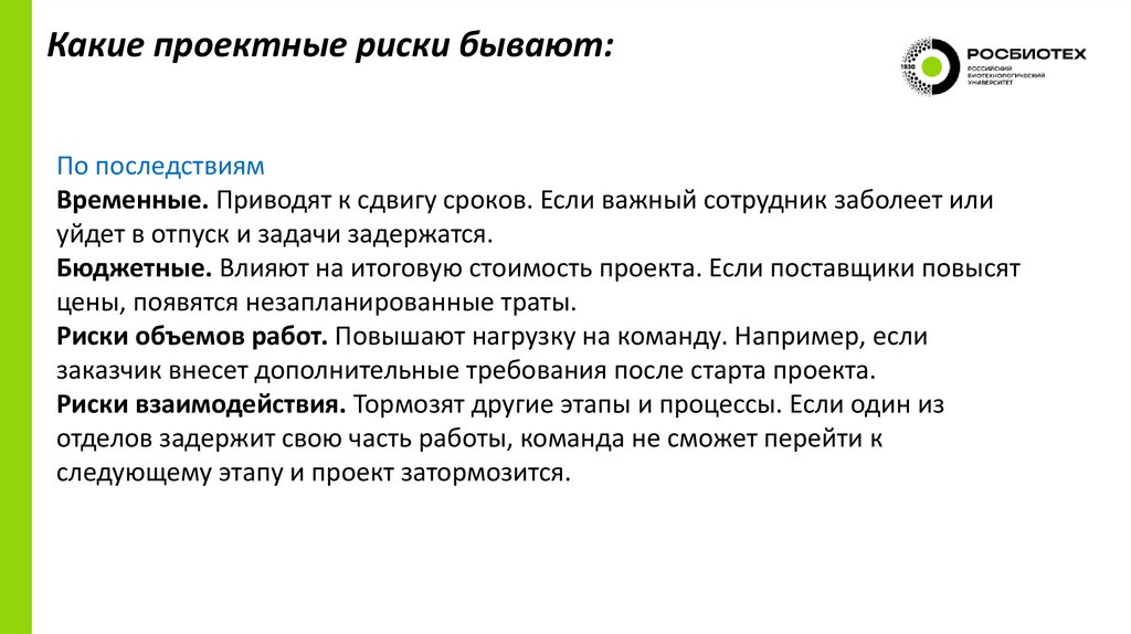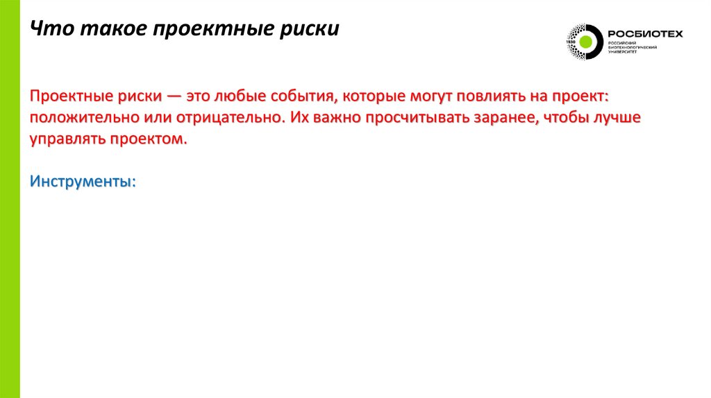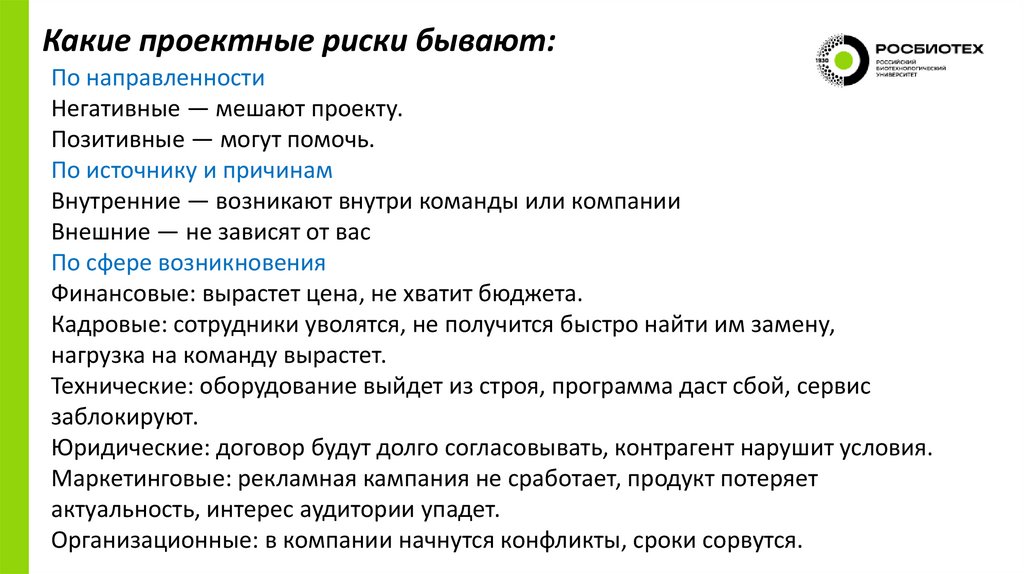 Что такое проектные рискиПроектные риски — это любые события, которые могут повлиять на проект:
