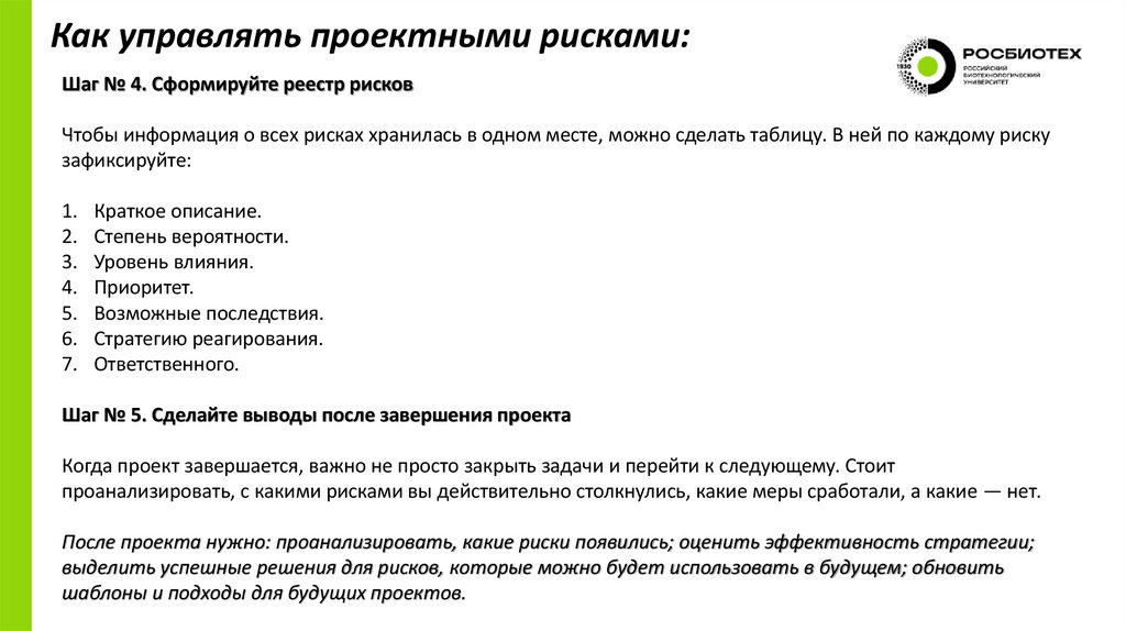 После проекта нужно: проанализировать, какие риски появились; оценить эффективность стратегии;