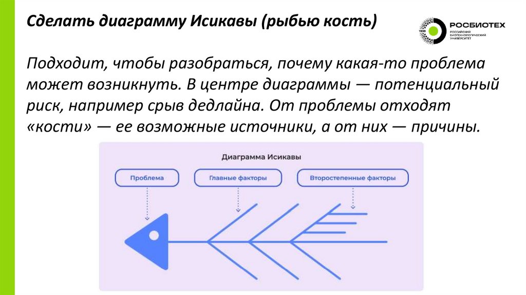 Сделать диаграмму Исикавы (рыбью кость)Подходит, чтобы разобраться, почему какая-то проблема