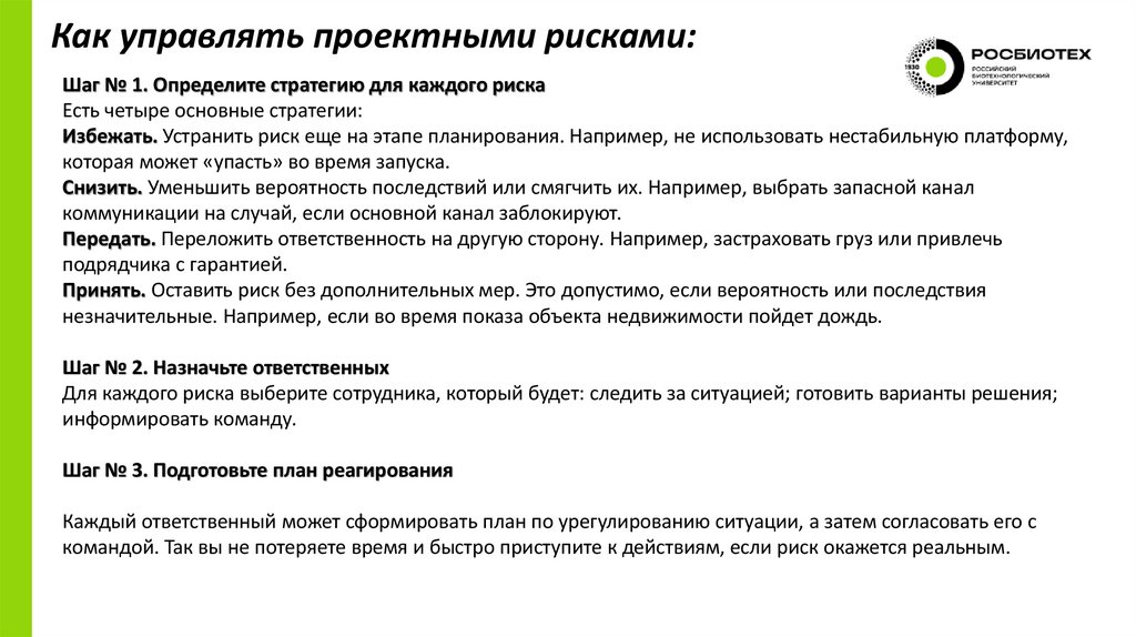 Как управлять проектными рисками:Шаг № 1. Определите стратегию для каждого риска