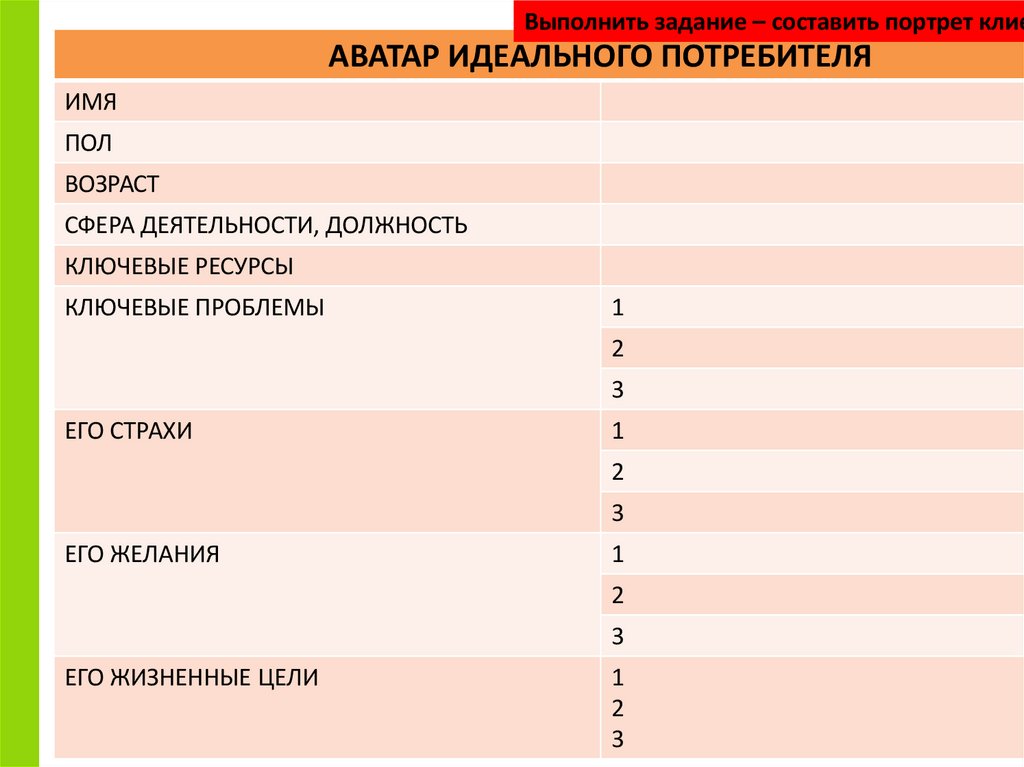 Выполнить задание – составить портрет клиеАВАТАР ИДЕАЛЬНОГО ПОТРЕБИТЕЛЯ