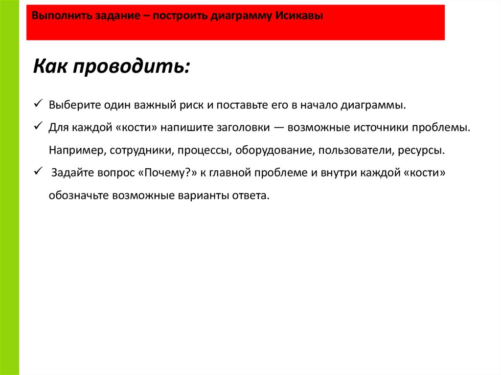 Выполнить задание – построить диаграмму ИсикавыКак проводить: