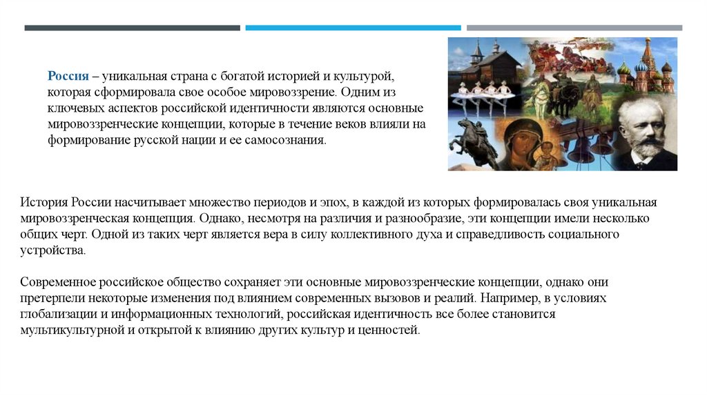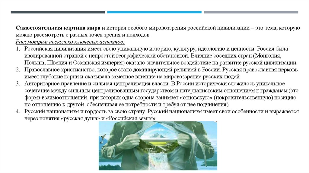 1. Российская цивилизация имеет свою уникальную историю, культуру, идеологию и ценности. Россия была