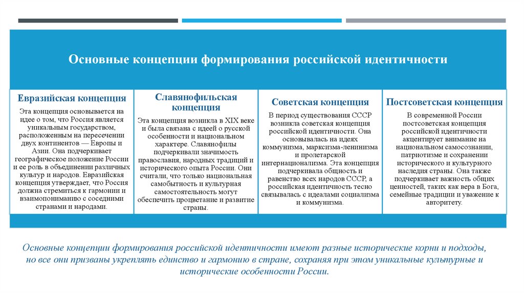 Основные концепции формирования российской идентичности имеют разные исторические корни и подходы,