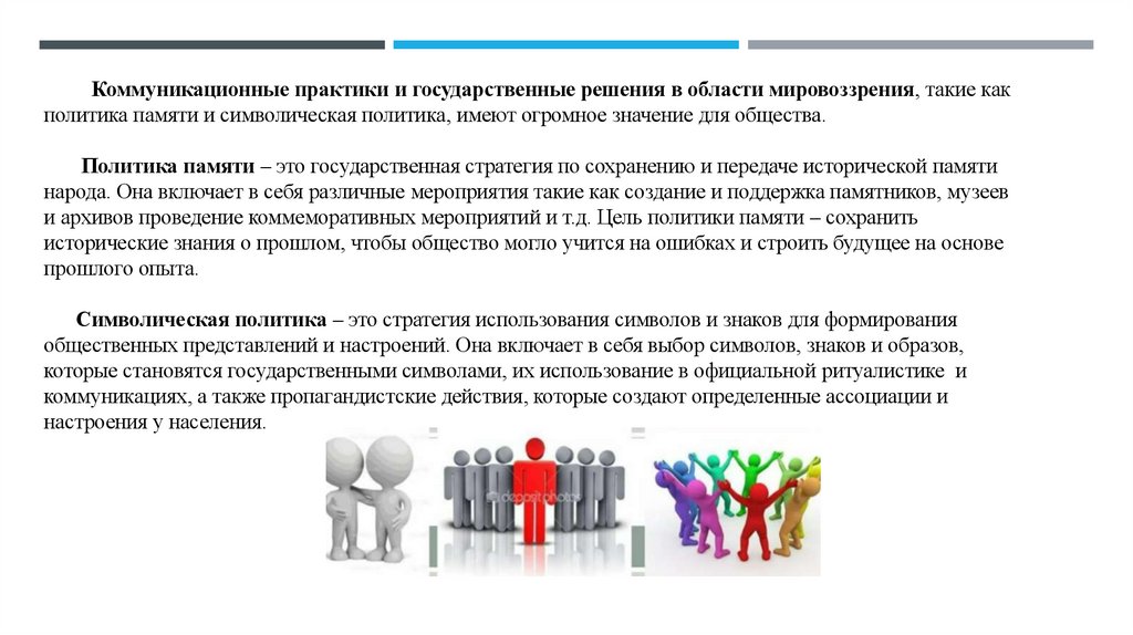 Коммуникационные практики и государственные решения в области мировоззрения, такие какполитика памяти и символическая политика, имеют огромное значение для общества.