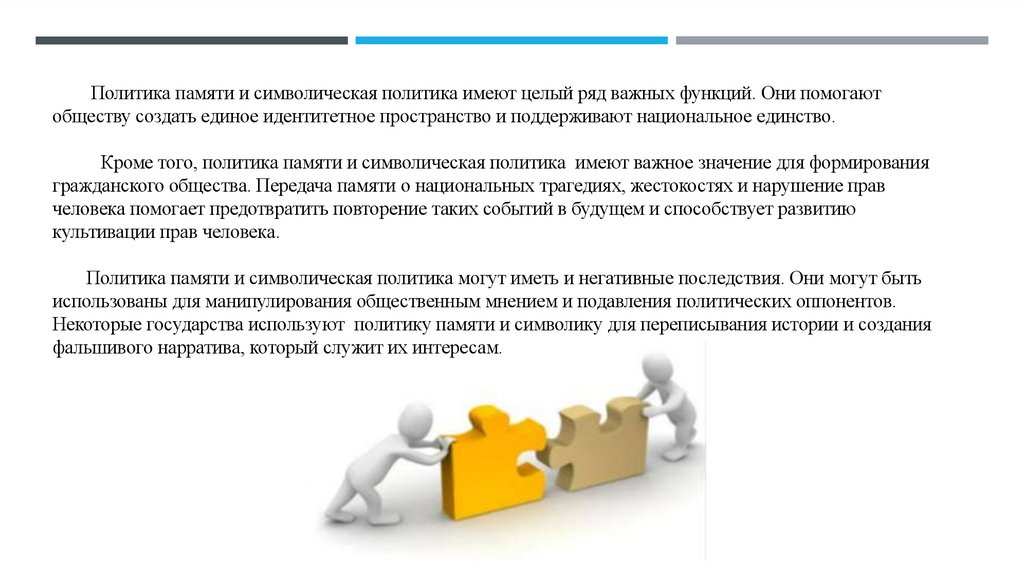 Политика памяти и символическая политика имеют целый ряд важных функций. Они помогаютобществу создать единое идентитетное пространство и поддерживают национальное единство.