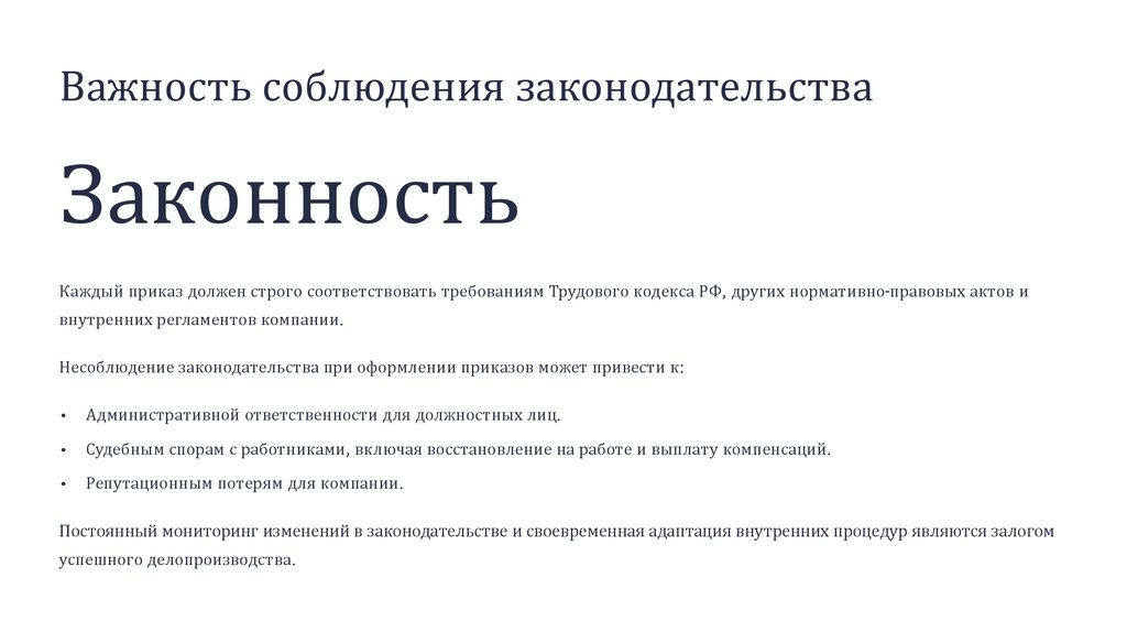 Каждый приказ должен строго соответствовать требованиям Трудового кодекса РФ, других нормативно-правовых актов и