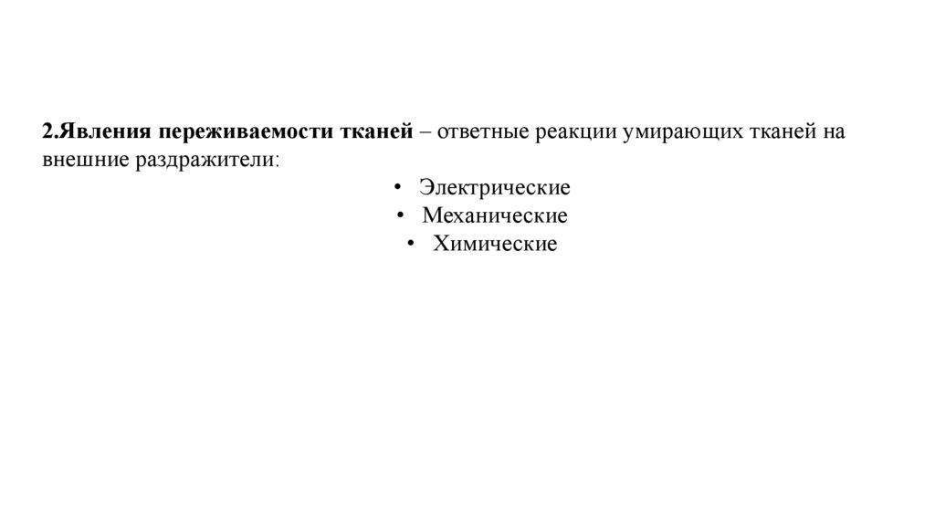 2.Явления переживаемости тканей – ответные реакции умирающих тканей навнешние раздражители: