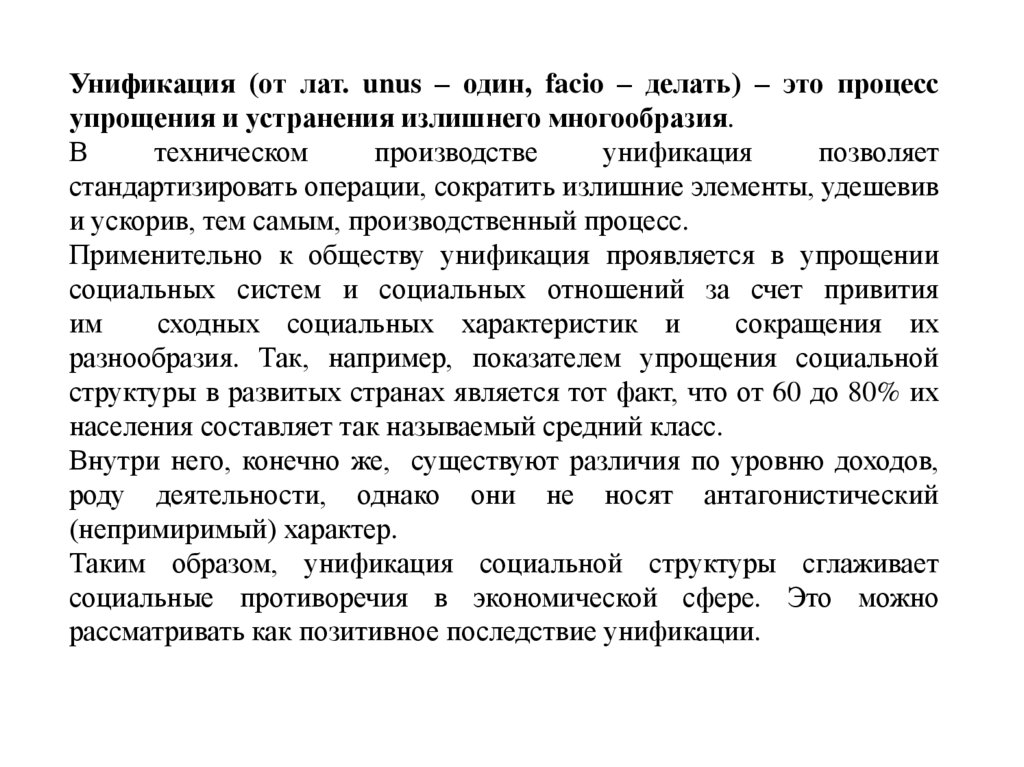 Применительно к обществу унификация проявляется в упрощении