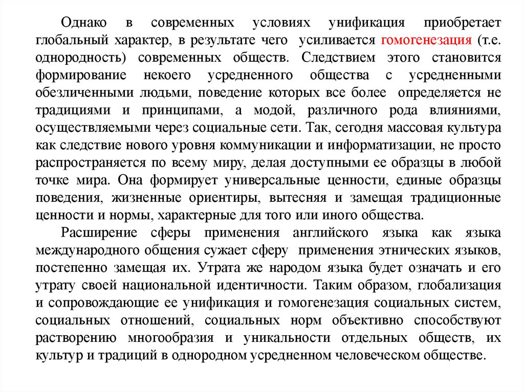 Однако в современных условиях унификация приобретаетглобальный характер, в результате чего усиливается гомогенезация (т.е.