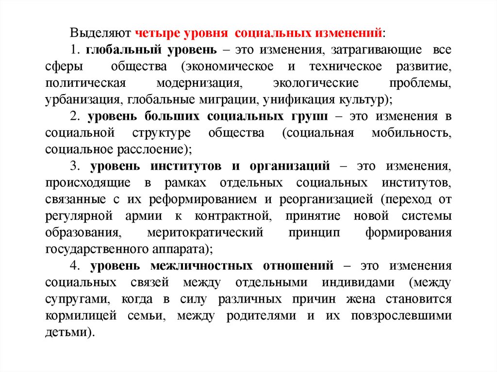 Выделяют четыре уровня социальных изменений:1. глобальный уровень – это изменения, затрагивающие все