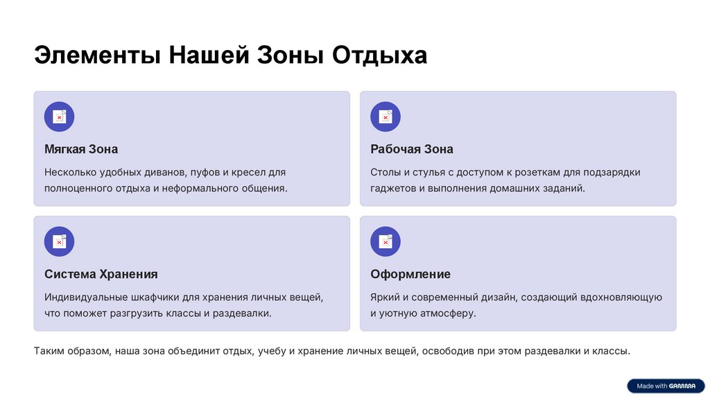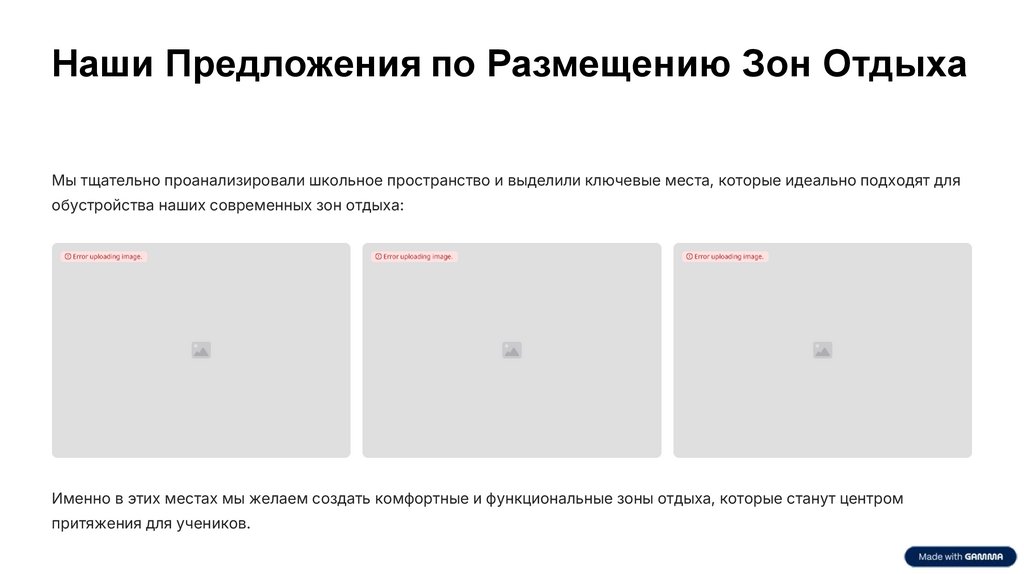Наши Предложения по Размещению Зон ОтдыхаМы тщательно проанализировали школьное пространство и выделили ключевые места, которые идеально подходят для