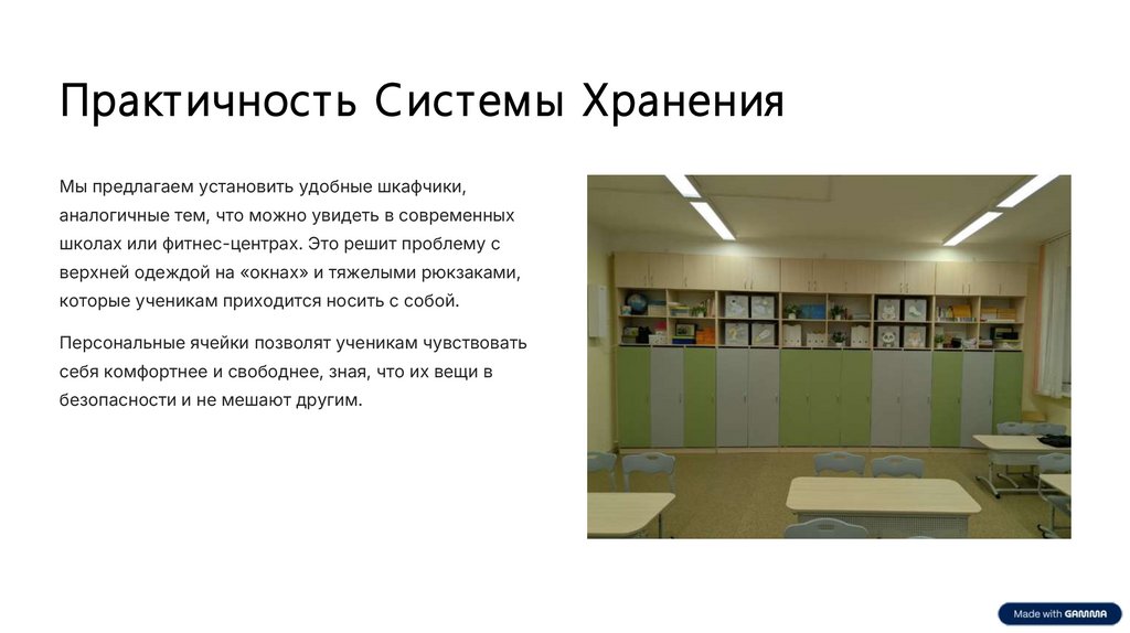 Таким образом, наша зона объединит отдых, учебу и хранение личных вещей, освободив при этом раздевалки и классы.