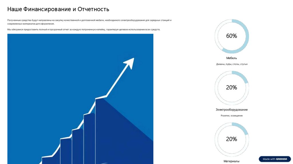Наше Финансирование и ОтчетностьПолученные средства будут направлены на закупку качественной и долговечной мебели, необходимого электрооборудования для зарядных станций и