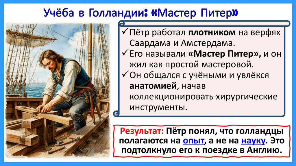 Пётр работал плотником на верфяхСаардама и Амстердама.
