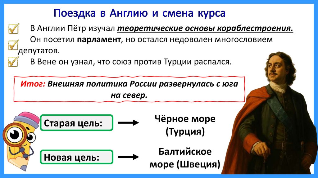В Англии Пётр изучал теоретические основы кораблестроения.Он посетил парламент, но остался недоволен многословием
