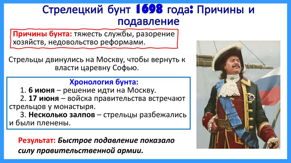 Причины бунта: тяжесть службы, разорениехозяйств, недовольство реформами.