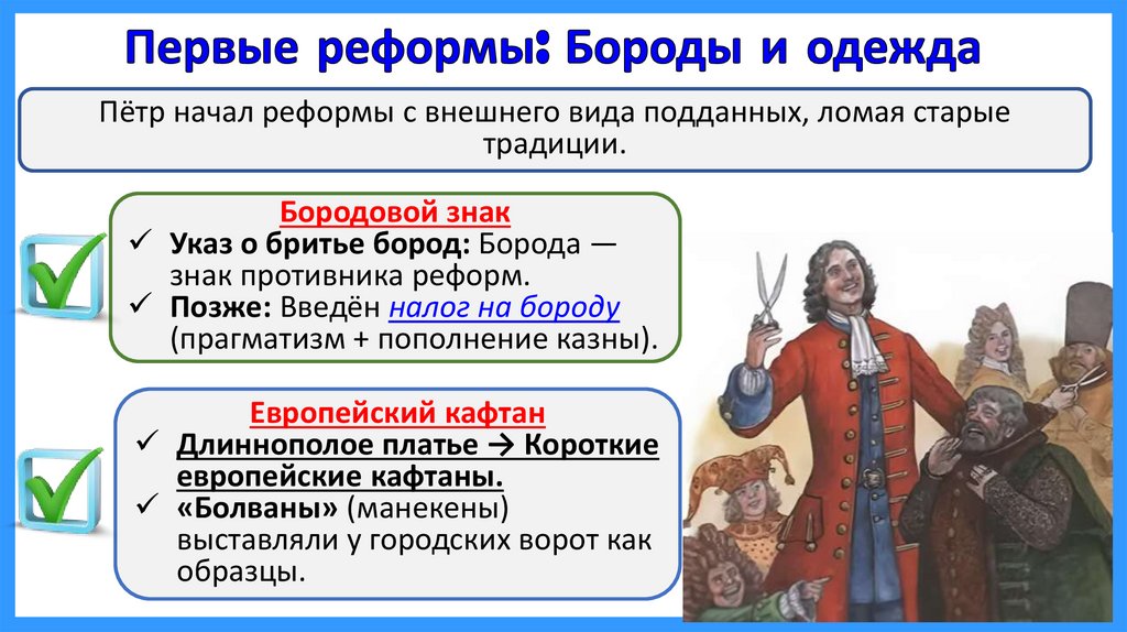 Пётр начал реформы с внешнего вида подданных, ломая старыетрадиции.