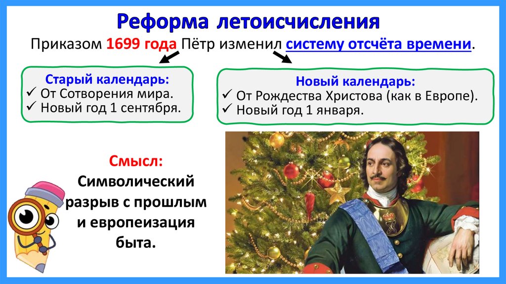 Приказом 1699 года Пётр изменил систему отсчёта времени.Старый календарь:
