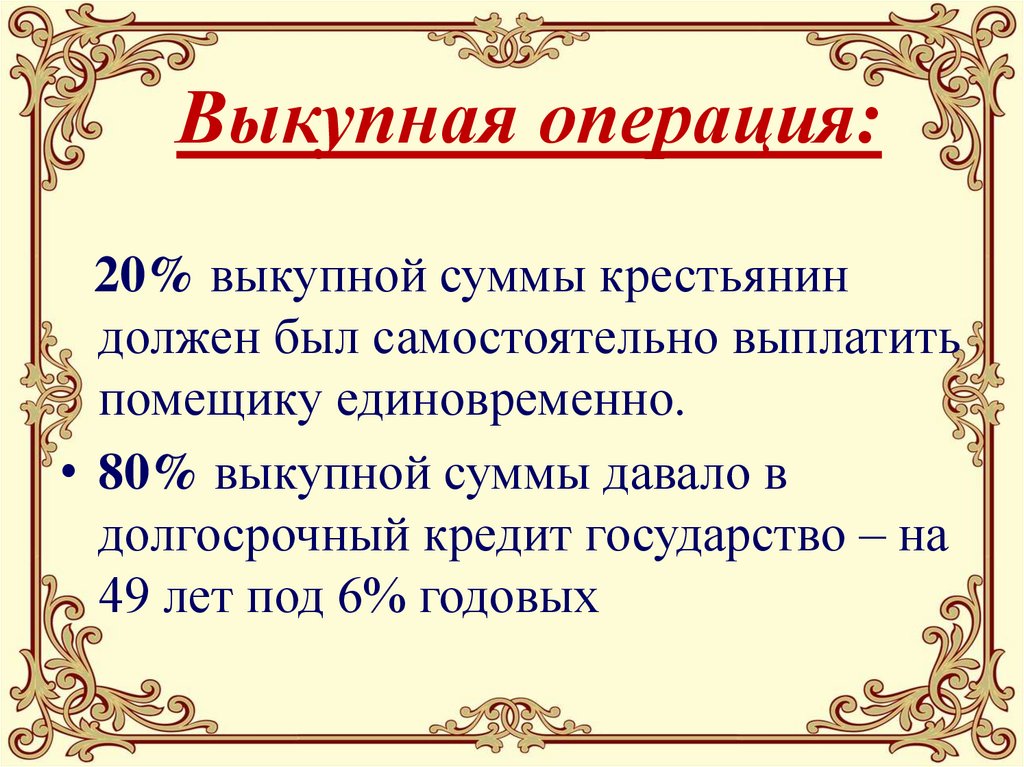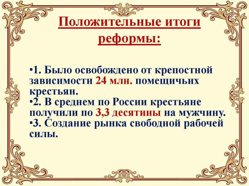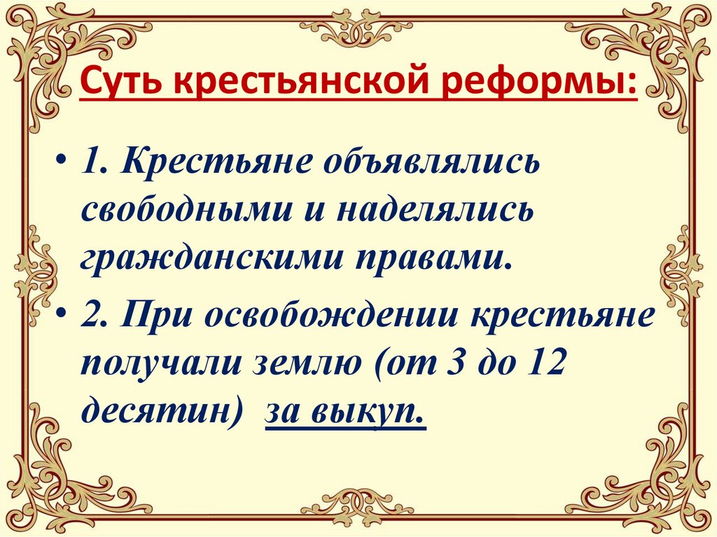 Суть крестьянской реформы:• 1. Крестьяне объявлялись