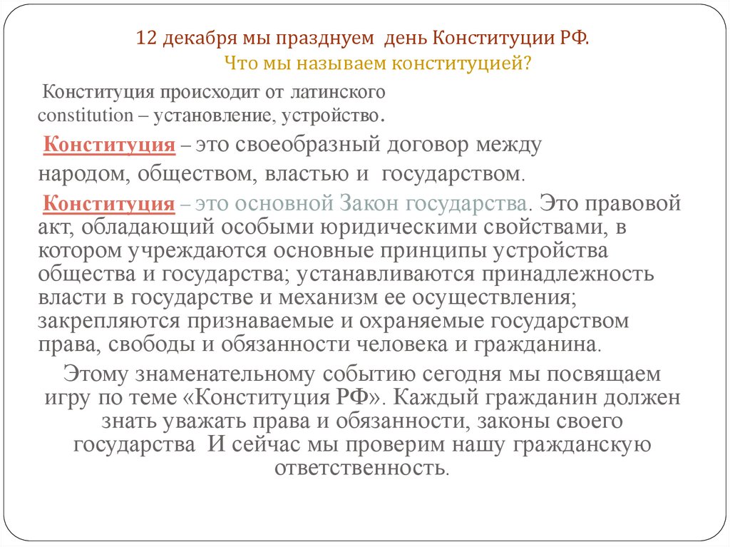 12 декабря мы празднуем день Конституции РФ.Что мы называем конституцией?