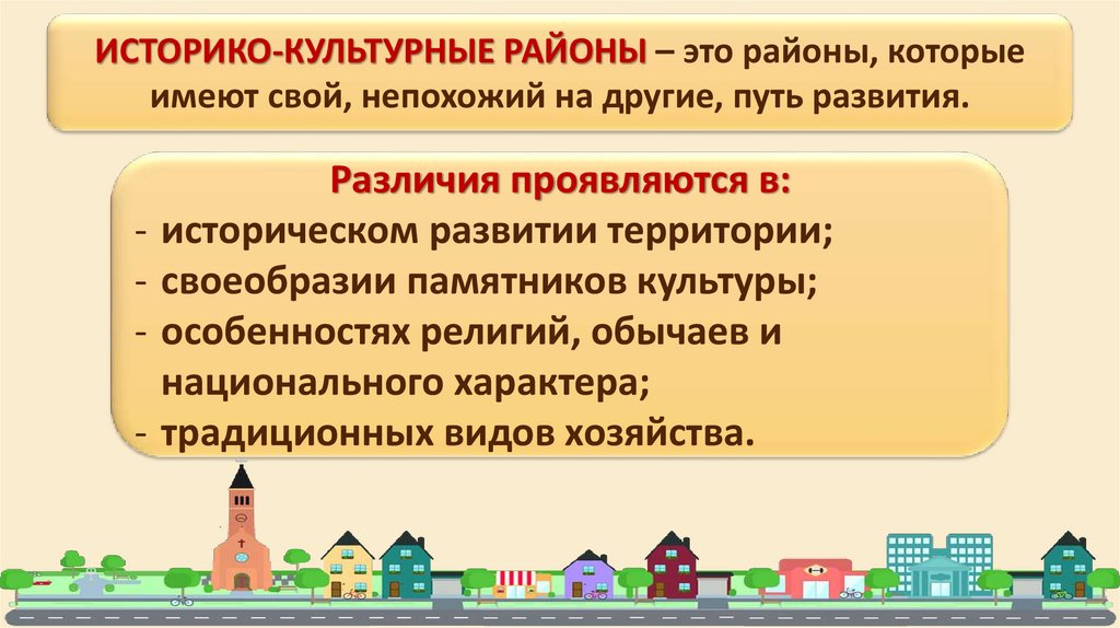 ИСТОРИКО-КУЛЬТУРНЫЕ РАЙОНЫ – это районы, которыеимеют свой, непохожий на другие, путь развития.