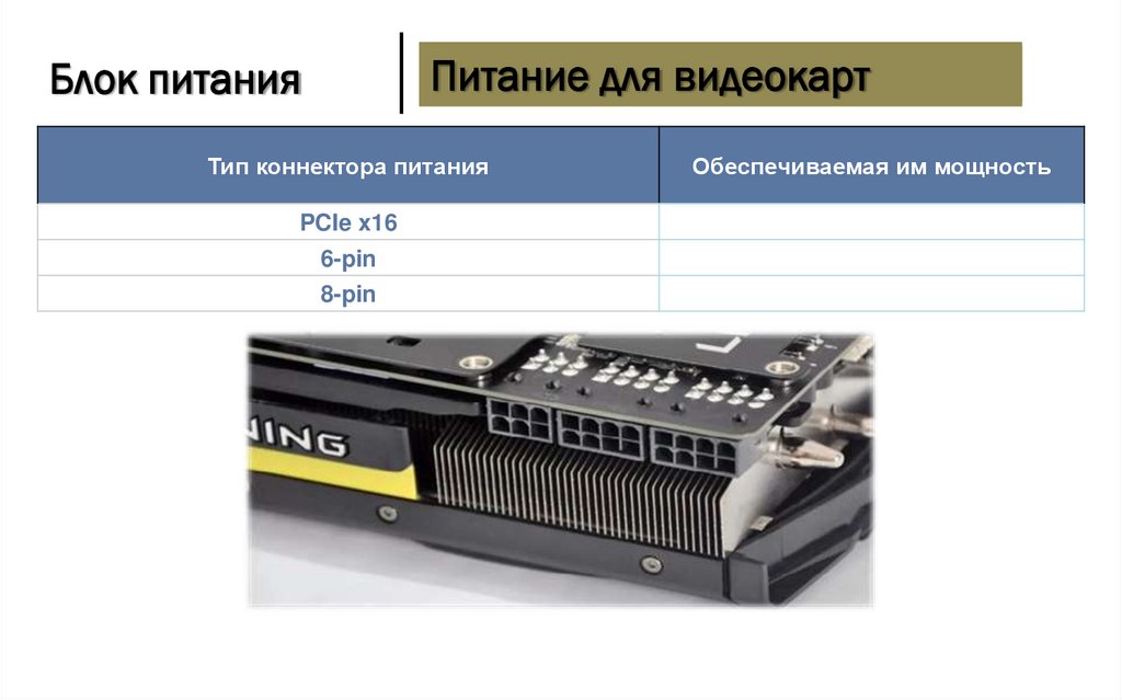 Более мощные версии видеокарт могут иметь 2 типа разъемов питания: 6пин и 8-пин, или оба сразу.