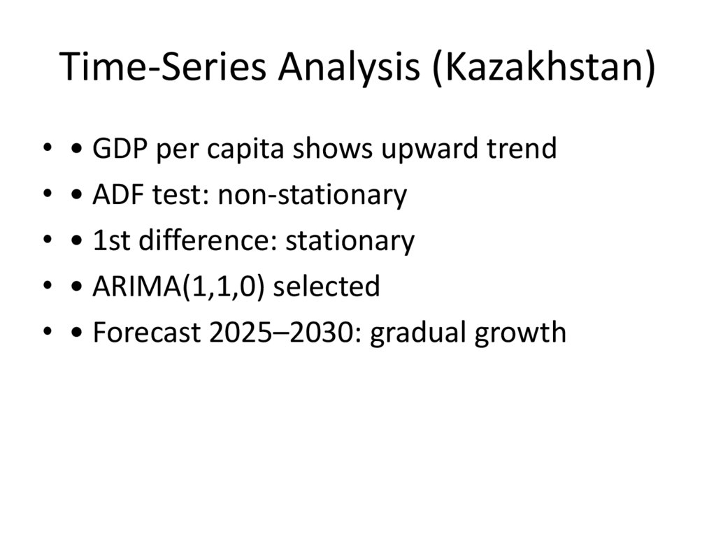 Time-Series Analysis (Kazakhstan)• • GDP per capita shows upward trend