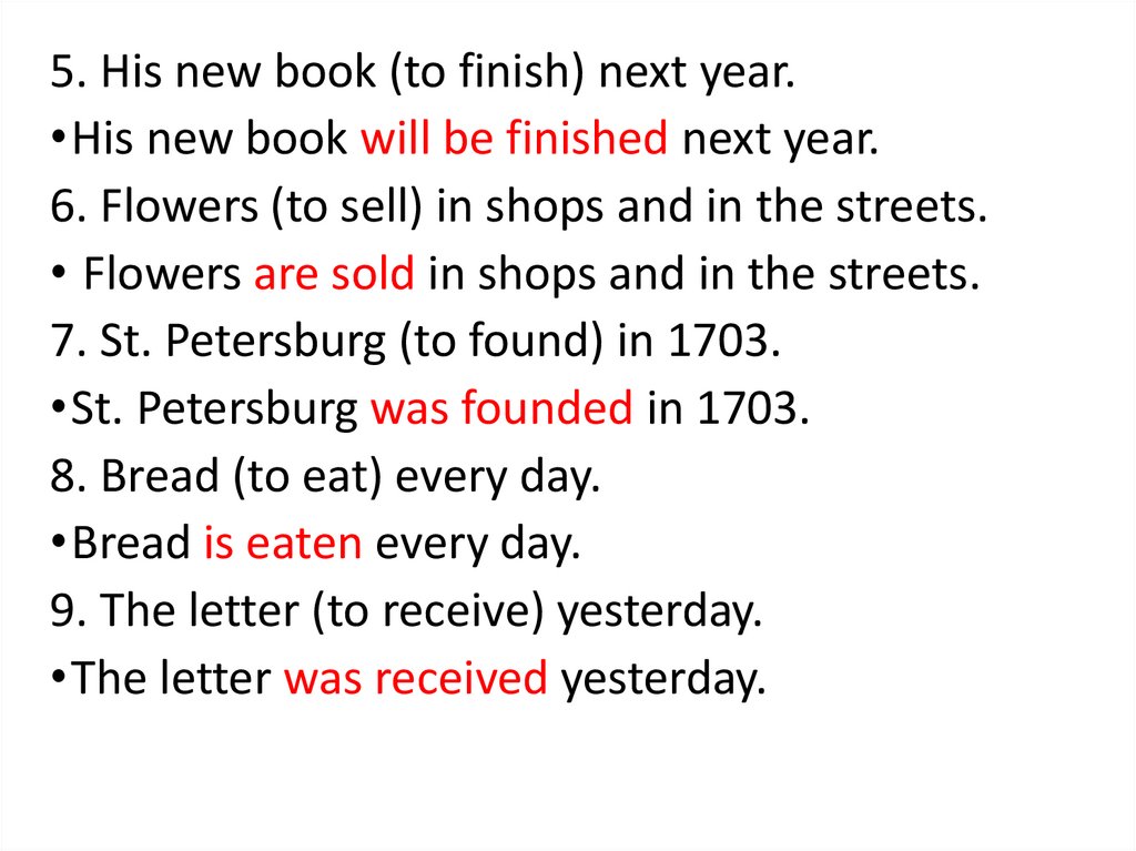 5. His new book (to finish) next year.•His new book will be finished next year.