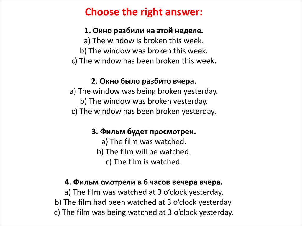 Choose the right answer:1. Окно разбили на этой неделе.