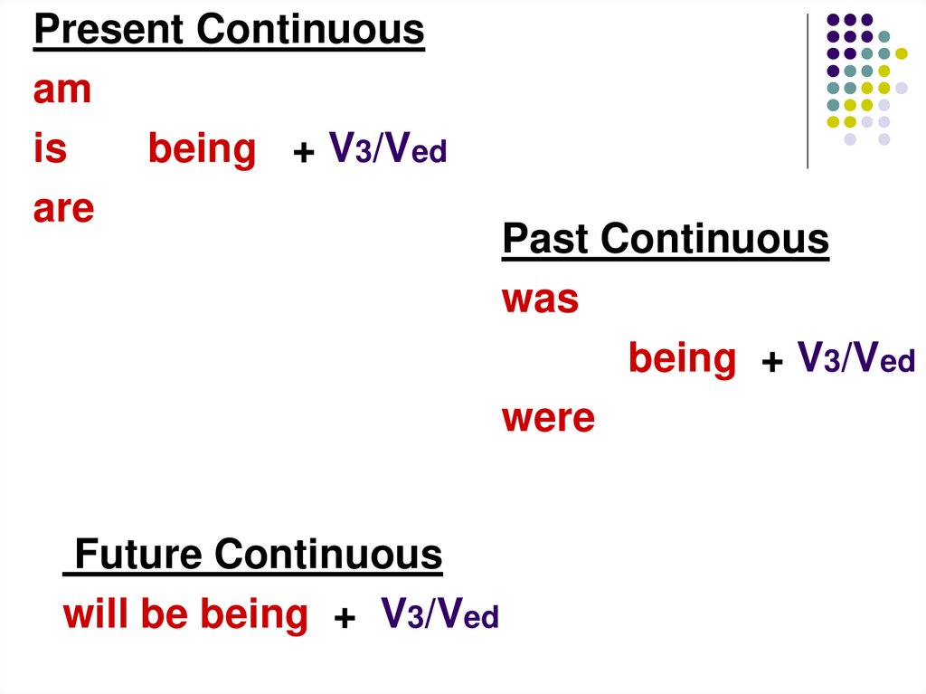 will be being + V3/Ved
