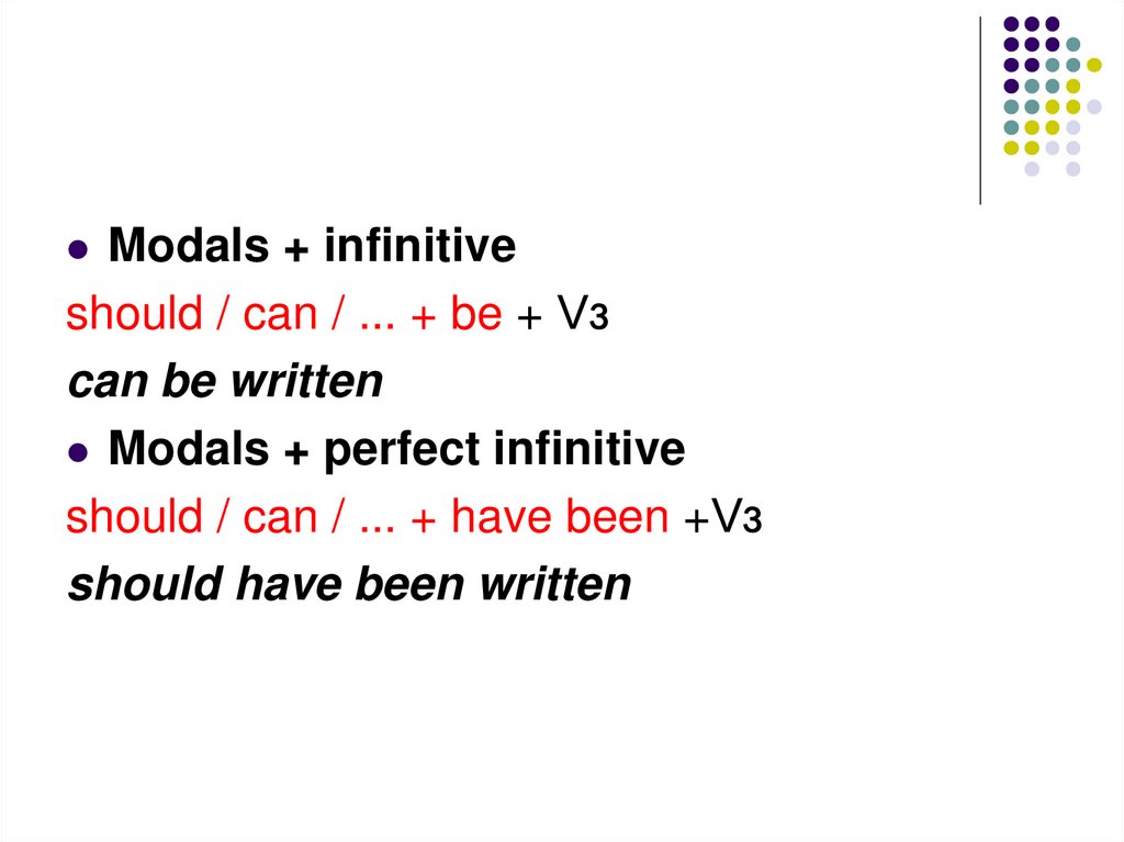 Modals + infinitiveshould / can / ... + be + Vз