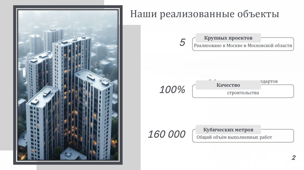 Мы реализовали более 500 000 м² жилых, коммерческих и социальных объектов по Москве и МО.