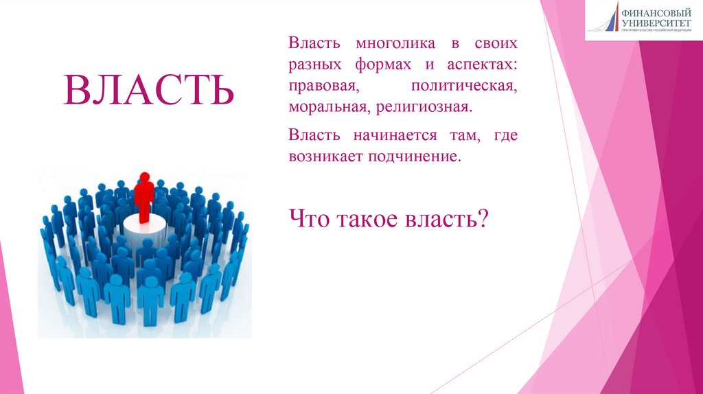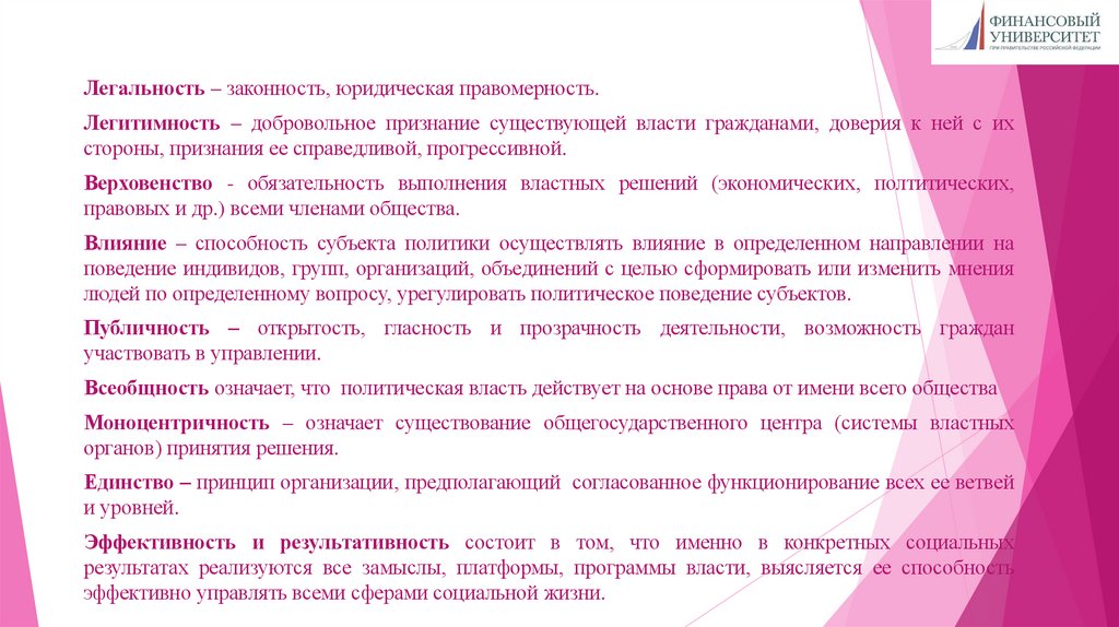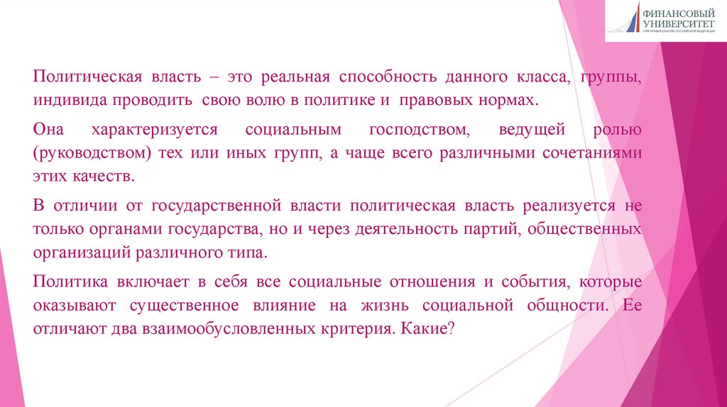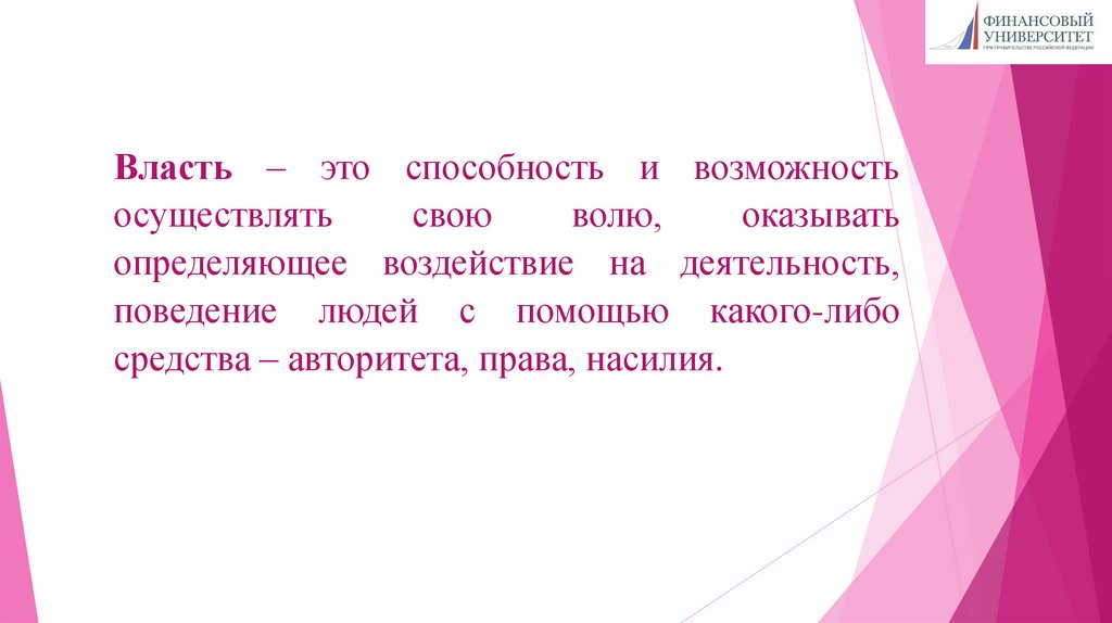 Понятие власти сводится к возможности принятия ею решений, регулирующих