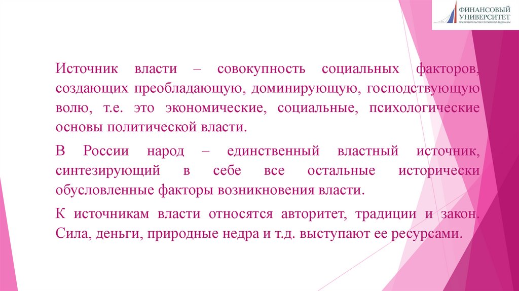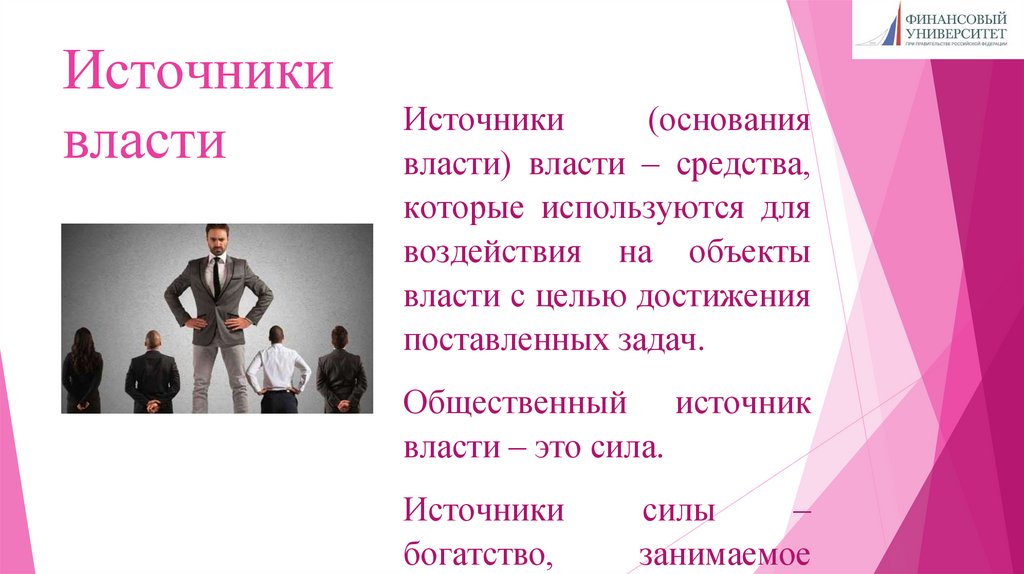 Источник власти – совокупность социальных факторов,создающих преобладающую, доминирующую, господствующую