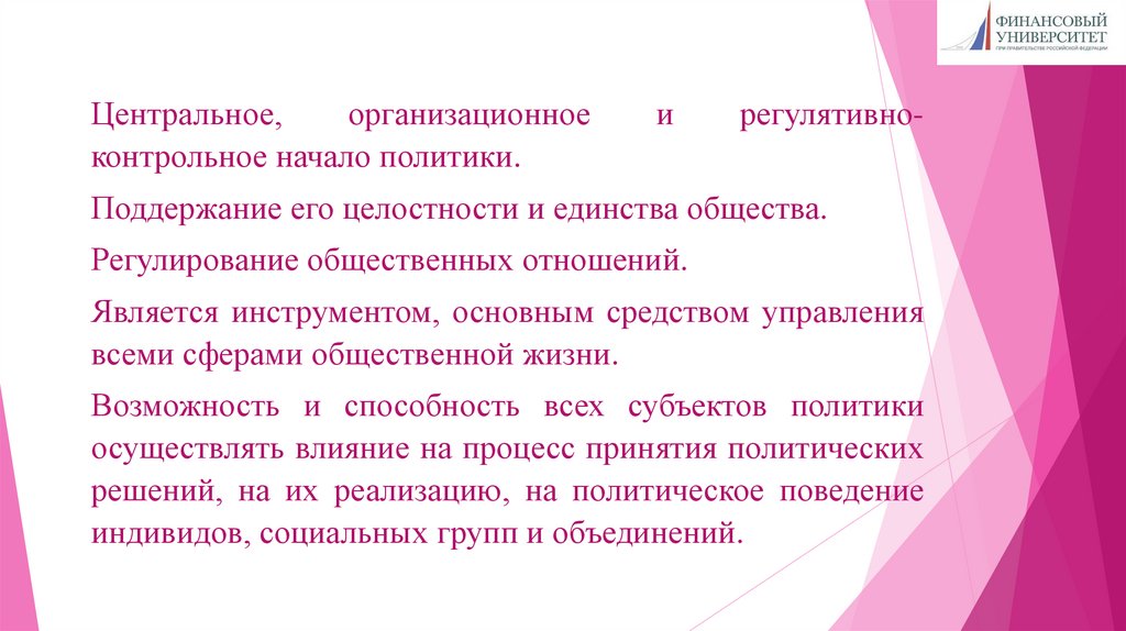 людей по определенному вопросу, урегулировать политическое поведение субъектов.