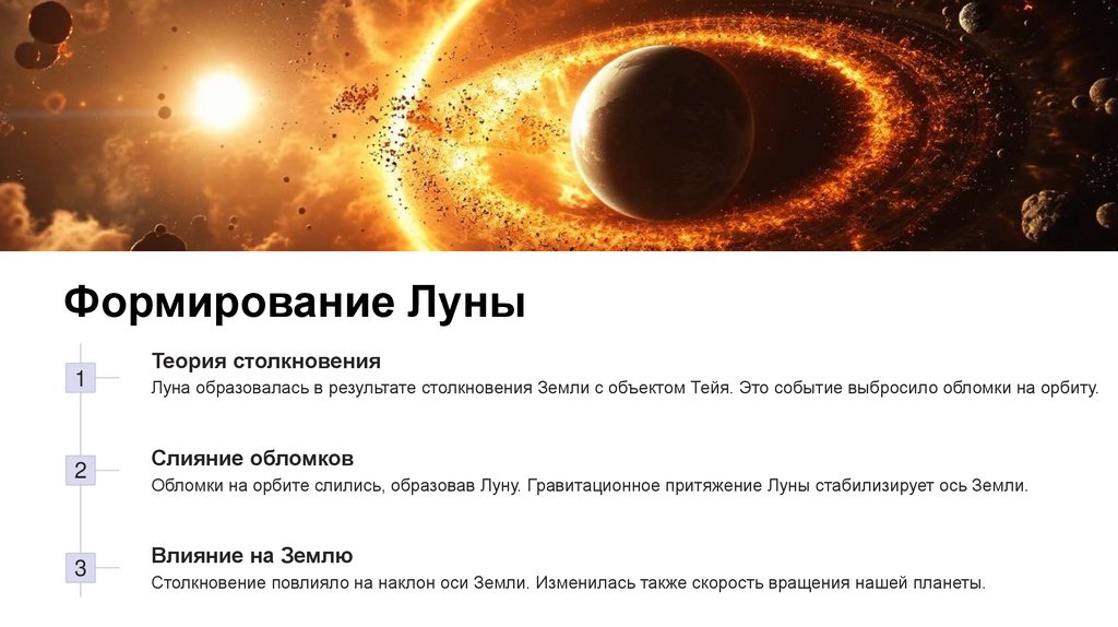 Луна образовалась в результате столкновения Земли с объектом Тейя. Это событие выбросило обломки на орбиту.