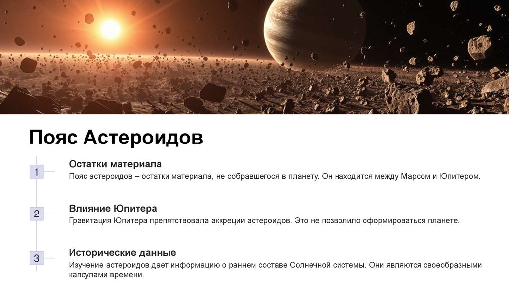 Пояс астероидов – остатки материала, не собравшегося в планету. Он находится между Марсом и Юпитером.
