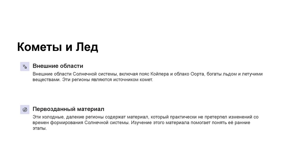 Внешние области Солнечной системы, включая пояс Койпера и облако Оорта, богаты льдом и летучими