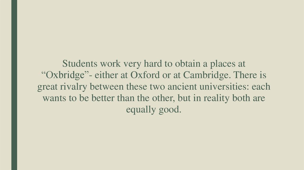 Students work very hard to obtain a places at“Oxbridge”- either at Oxford or at Cambridge. There is