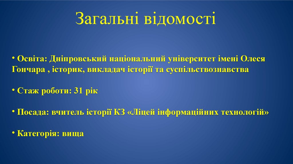 • Посада: вчитель історії КЗ «Ліцей інформаційних технологій»