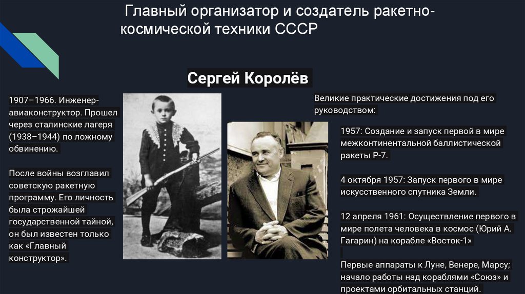 Главный организатор и создатель ракетнокосмической техники СССРСергей Королёв