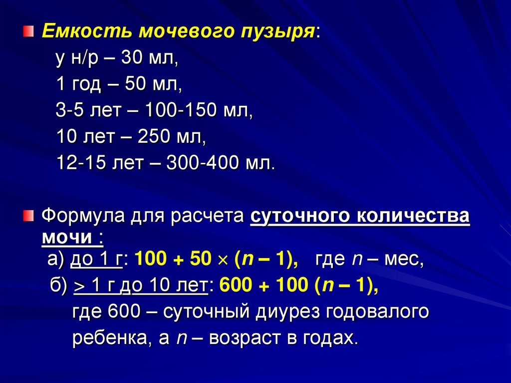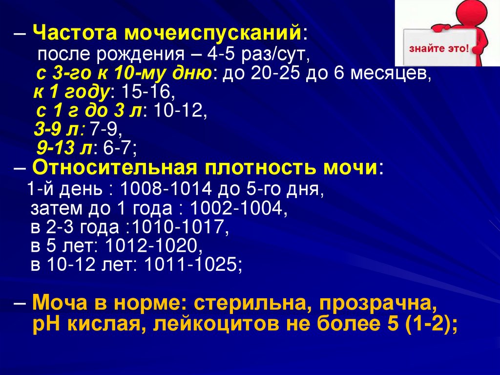 – Частота мочеиспусканий:после рождения – 4-5 раз/сут,
