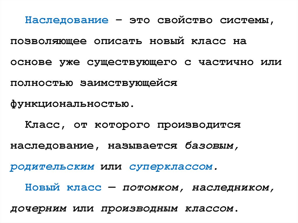 Наследование – это свойство системы,позволяющее описать новый класс на