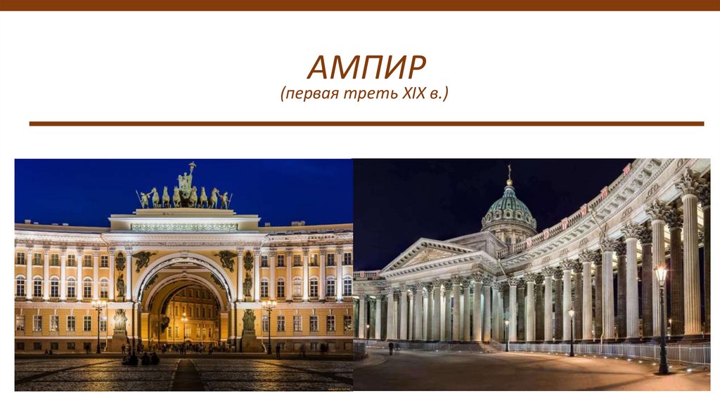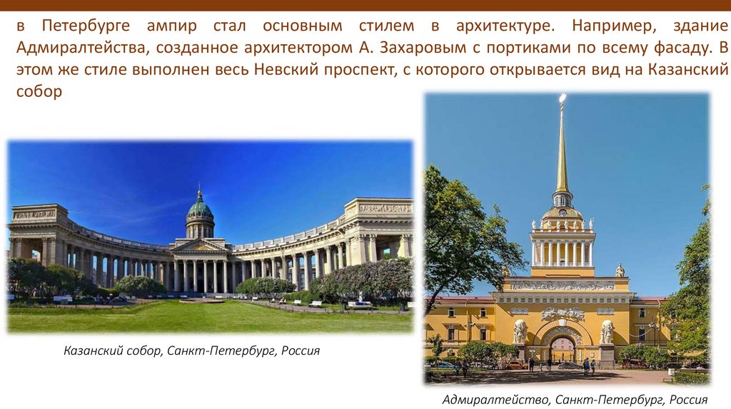 в Петербурге ампир стал основным стилем в архитектуре. Например, зданиеАдмиралтейства, созданное архитектором А. Захаровым с портиками по всему фасаду. В